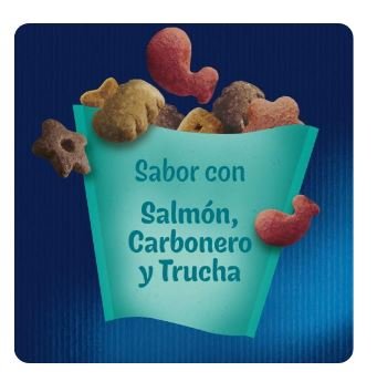 Carnes y subproductos animales, Cereales, Aceites y grasas, Extractos de proteínas vegetales, Pescados y subproductos del pescado (2%)*, Sustancias minerales, Azúcares, Levaduras. (* equivalente a 3,5% pescado y subproductos de pescado rehidratados, con 0,5% Salmón, 0,5% Pescado Blanco y 0,5% Trucha).