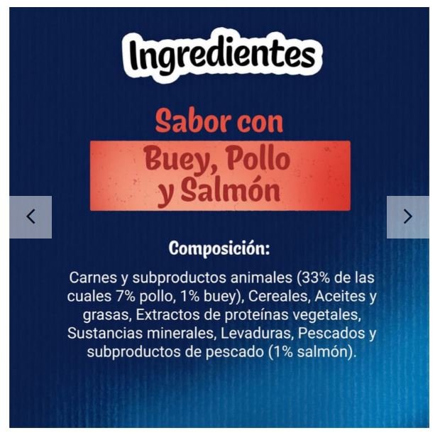 Carne y subproductos animales (35% del cual un 50% es rehidratado con un contenido de carne mínimo de 26%, 0,5% de carne de vacuno, 0,5% de pollo), cereales, aceites y grasas, extractos de proteínas vegetales, minerales, azúcar, levadura, pescado y subproductos de pescado (1% del cual un 2% es rehidratado con 0,5% salmón).