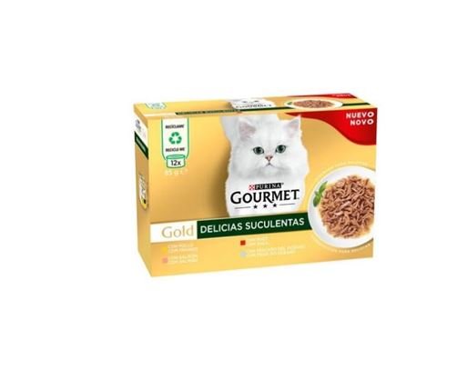 El pack Gourmet Gold Delicias suculentas surtido de pescados y carnes te ofrece 12 latas de 85g cada una con 4 recetas diferentes para que tu gato disfrute de los sabores de la gama. Son un alimento húmedo de alta calidad que cuida la salud de tu mascota día a día.