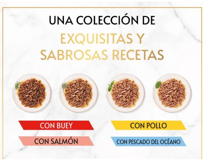 La variedad Delicias Suculentas posee una nueva textura de finos cortes suculentos de proteínas de carnes o pescados cocinados a fuego lento en una deliciosa salsa. Puedes escoger entre los sabores de pollo, buey, salmón y pescado del océano, para ofrecerle variedad a la mascota.