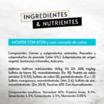 Carnes y subproductos animales, Pescado y subproductos de pescado (atún 4%) subproductos de origen vegetal, sustancias minerales, azúcares.