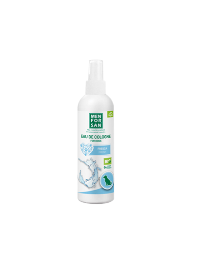 Agua de colonia para perros de fragancia fresca con notas florales (fresh) especialmente creada para proporcionar después del baño un olor fresco y un intenso efecto desodorante muy agradable respetando la piel y las propiedades olfativas del animal. No contiene alcohol y tiene pH neutro careciendo de efectos irritantes y evitando que el perro estornude después de su aplicación.