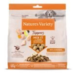 Complementa la alimentación de tu amigo peludo con estos toppers de pollo (80%) y verduras y frutas (20%) para perros adultos de todas las razas. Son ideales para mezclarlos con el pienso o con la comida húmeda, para ofrecer más variedad de sabores y texturas a la dieta habitual.