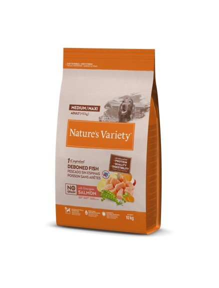 Carne de salmón noruego sin espinas*(16%), proteína deshidratada de atún (15%), guisantes deshidratados* (13%), patata deshidratada* (11%), grasa avícola* (8%), bonito* (6%), proteína deshidratada de salmón (6%), proteína de guisante*, proteínas animales hidrolizadas (ave, cerdo, pescado) (4%), pulpa de remolacha*, sustancias minerales, zanahoria deshidratada* (0,5%, equivalente a un 4% de zanahoria fresca), manzana deshidratada* (0,3%, equivalente a un 2% de manzana fresca), algas marinas deshidratadas (kelp)* (0,01%), romero deshidratado* (0,01%). *Ingredientes naturales.