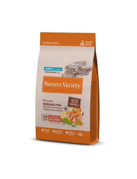 Carne de salmón noruego sin espinas* (20%), proteína deshidratada de atún (18%), guisantes deshidratados* (15%), patata deshidratada* (8%), proteína de patata, grasa avícola* (7%), boniato* (4%), proteínas animales hidrolizadas (ave, cerdo, pescado) (4%), almidón de guisante*, pulpa de remolacha*, sustancias minerales, proteína de guisante*, zanahoria deshidratada * (0,5%, equivalente a un 4% de zanahoria fresca), manzana deshidratada*, (0,3% equivalente a un 2% de manzana fresca), algas marinas deshidratas (kelp)* (0,01%), romero deshidratado* (0,01%). *Ingredientes naturales.