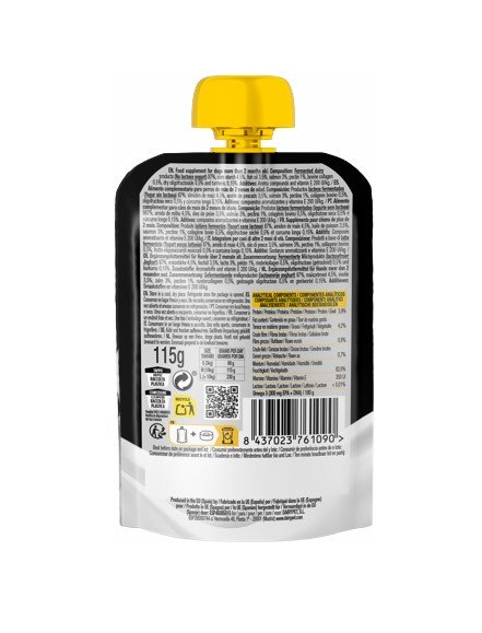 Productos lácteos fermentados (Yogur sin lactosa) 87%, almidón de maíz 3,5%, aceite de pescado 3,5%, salmón 3%, pectina 1%, colágeno bovino 0,5%, oligofructosa seca 0,5% y cúrcuma longa 0,01%.